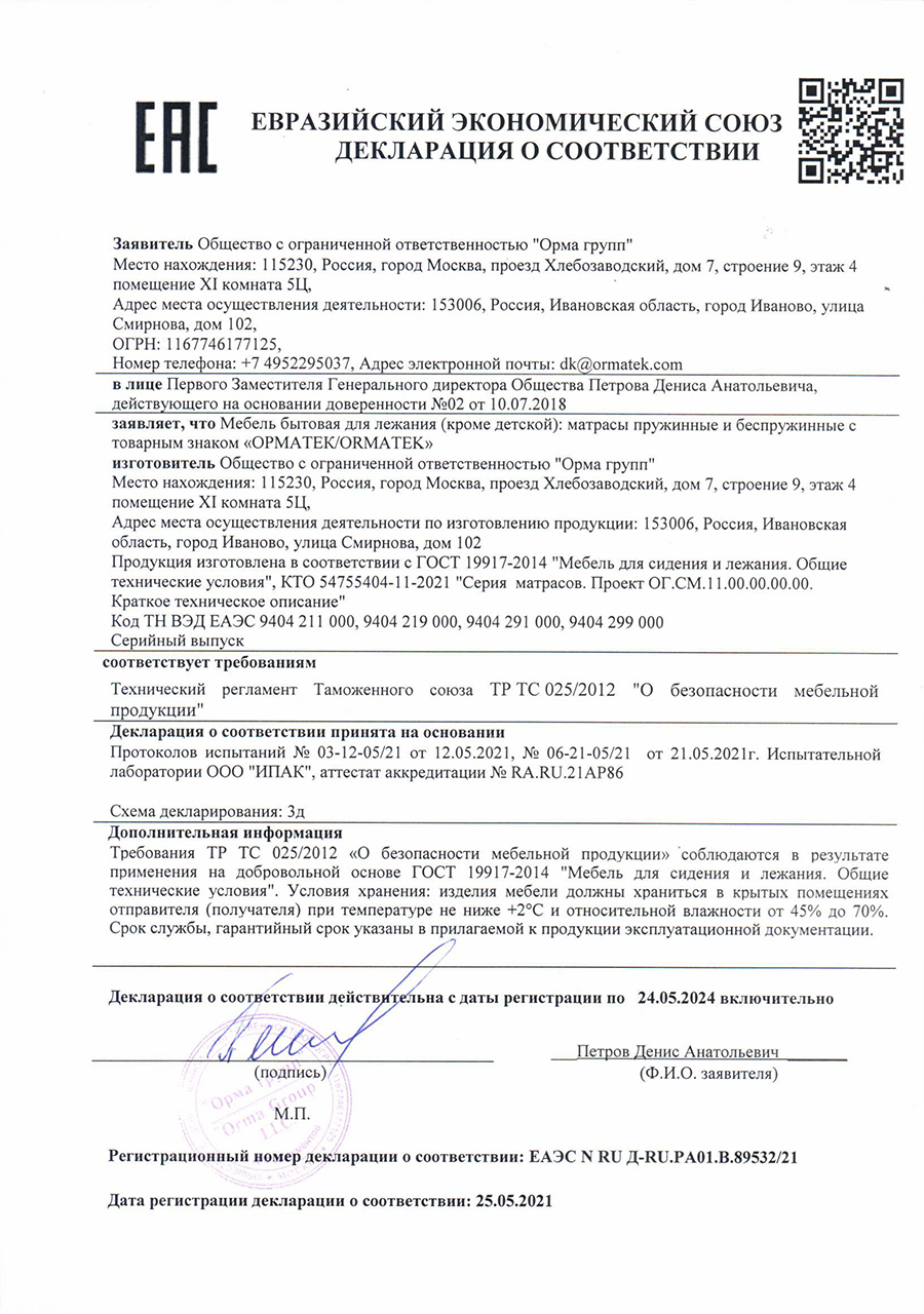 В составе матраса используется Ormafoam (ППУ), которая обладает повышенной упругостью, функциональностью и долговечностью.